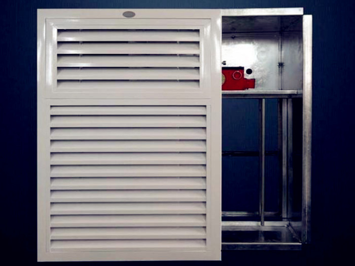 正壓送風(fēng)口作用:當(dāng)發(fā)生火災(zāi)時(shí),其內(nèi)部的電機(jī)會打開風(fēng)口,溫感煙感或者是手動火災(zāi)報(bào)警會開啟,塔樓頂正壓風(fēng)機(jī)自動打開,對送風(fēng)豎井進(jìn)行加壓送風(fēng),樓梯的前室通過正壓送風(fēng)口會源源不斷的對前室進(jìn)行送風(fēng),使前室維持正壓,保證煙氣不會再這個(gè)區(qū)域蔓延,而給人逃生的空間。當(dāng)溫度高于280°C時(shí)人已無逃生可能性,其內(nèi)部熔斷器會熔斷,風(fēng)口自動關(guān)閉,防止火勢蔓延。
